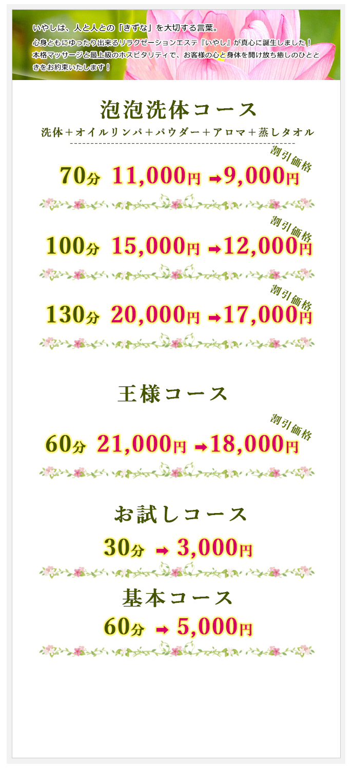 当店はアロマオイルを主体にしたリラクゼーションサロンでございます。日々の肉体的な疲れを全身指圧マッサージとアロマオイルマッサージを用いて、筋肉の疲労をケアし、疲れを少しでもご解消いただけますよう精一杯マッサージさせて頂きます。